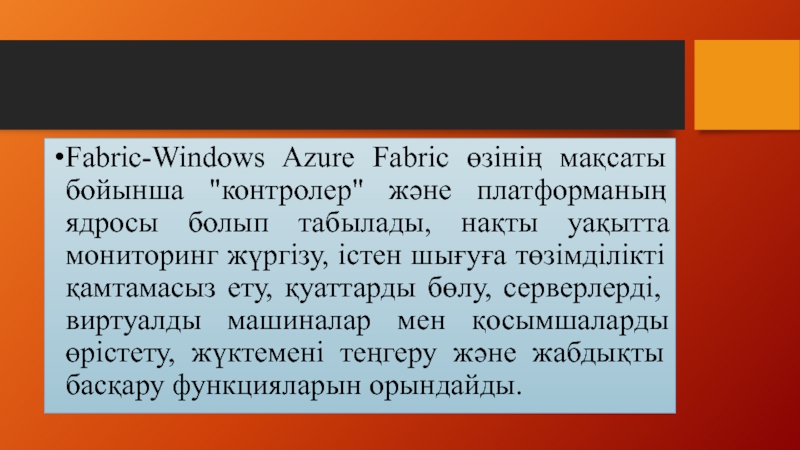 Слайд 9Fabric-Windows Azure Fabric өзінің мақсаты бойынша "контролер" және платформаның ядросы