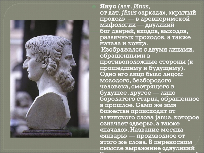 Слайд 10Янус (лат. Jānus, от лат. jānus «аркада», «крытый проход» — в древнеримской мифологии — двуликий бог дверей, входов,