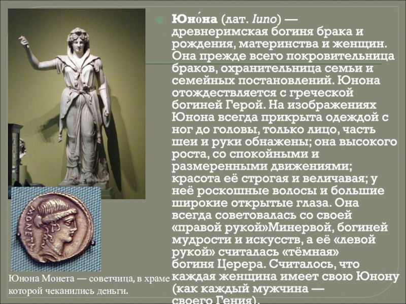 Слайд 4Юно́на (лат. Iuno) — древнеримская богиня брака и рождения, материнства и женщин. Она прежде
