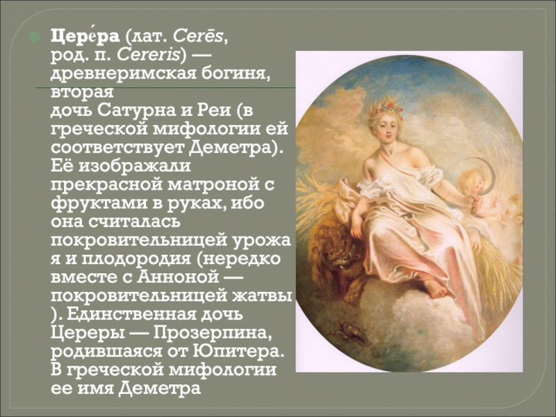 Слайд 7Цере́ра (лат. Cerēs, род. п. Cereris) — древнеримская богиня, вторая дочь Сатурна и Реи (в греческой мифологии ей соответствует Деметра).