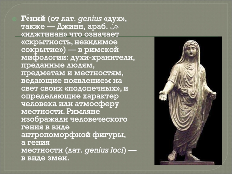 Слайд 5Ге́ний (от лат. genius «дух», также — Джинн, араб. جن «иджтинан» что означает «скрытность, невидимое сокрытие») — в