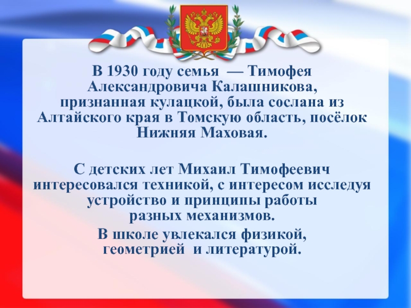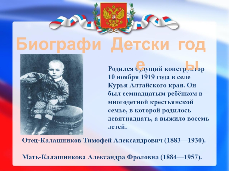 в которой родилось девятнадцать, а выжило восемь детей.Отец-Калашников Тимофей Александрович (1883—1930).