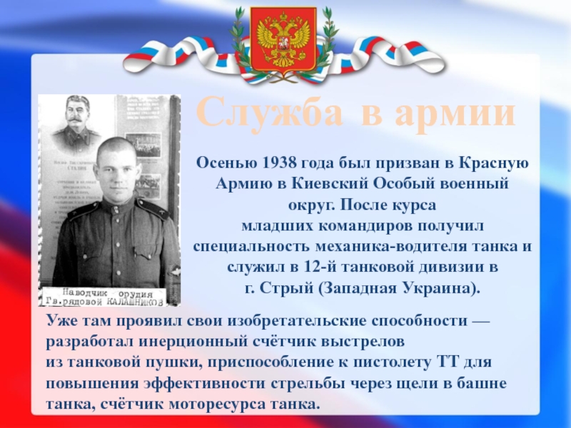 Уже там проявил свои изобретательские способности — разработал инерционный счётчик выстрелов из танковой пушки, приспособление к пистолету ТТ для повышения эффективности стрельбы через щели в башне танка, счётчик моторесурса танка.