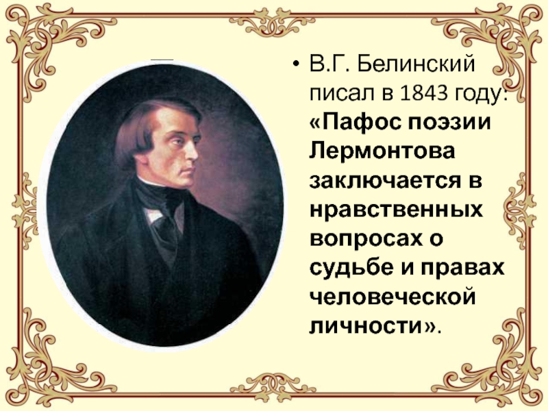 Слайд 21В.Г. Белинский писал в 1843 году: «Пафос поэзии Лермонтова заключается