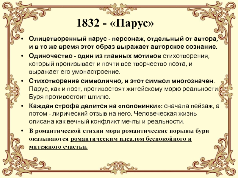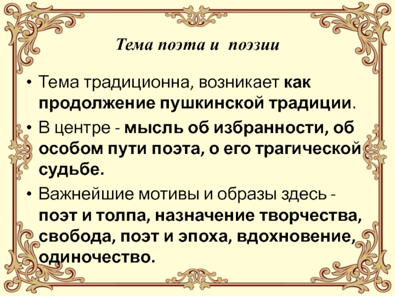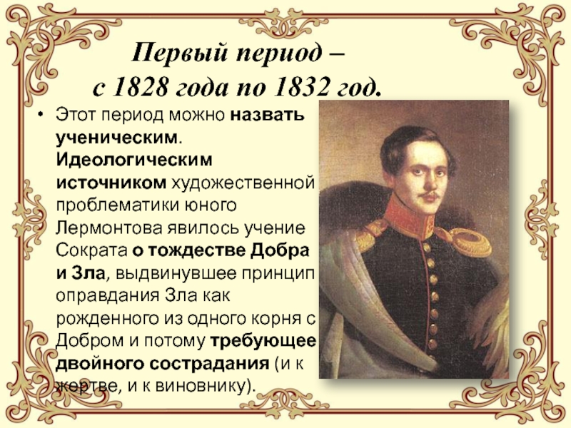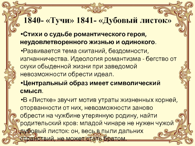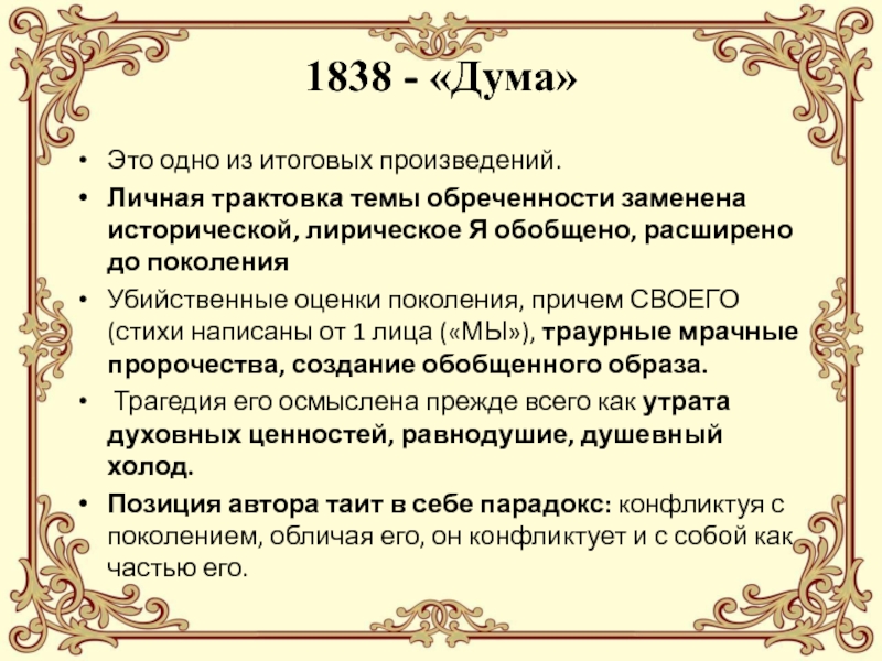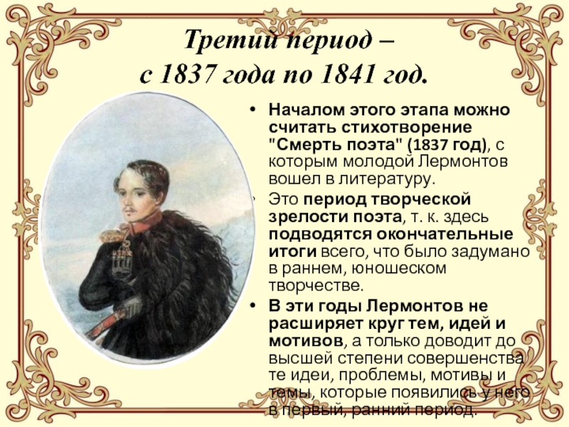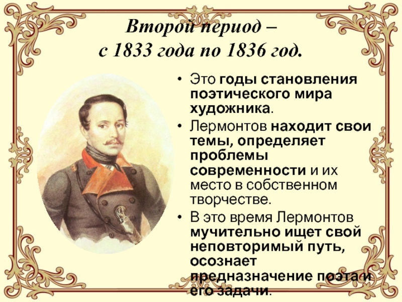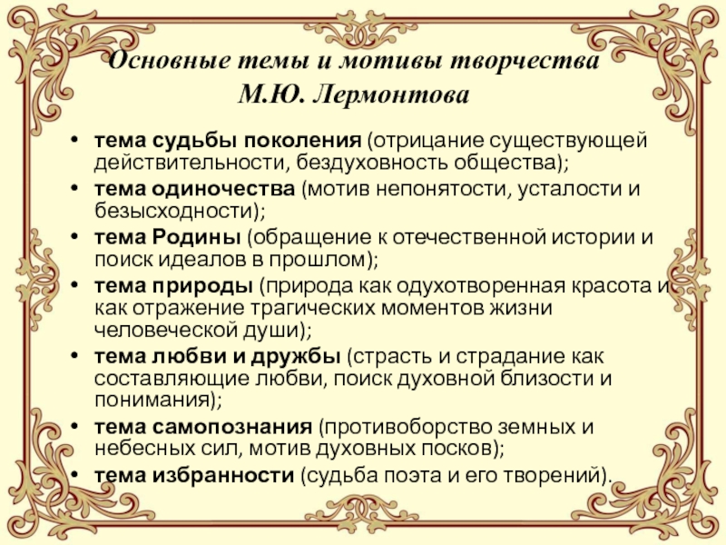 В эти годы Лермонтов не расширяет круг тем, идей и мотивов, а только доводит до высшей степени совершенства те идеи, проблемы, мотивы и темы, которые появились у него в первый, ранний период.