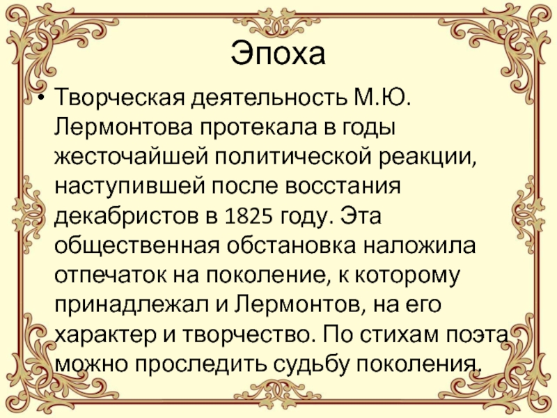 Творческая деятельность М.Ю. Лермонтова протекала в годы жесточайшей политической реакции,