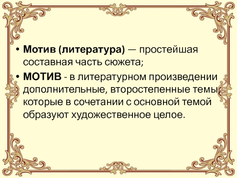 Слайд 3Мотив (литература) — простейшая составная часть сюжета;