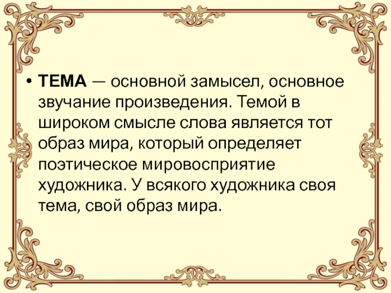Слайд 4ТЕМА — основной замысел, основное звучание произведения. Темой в широком