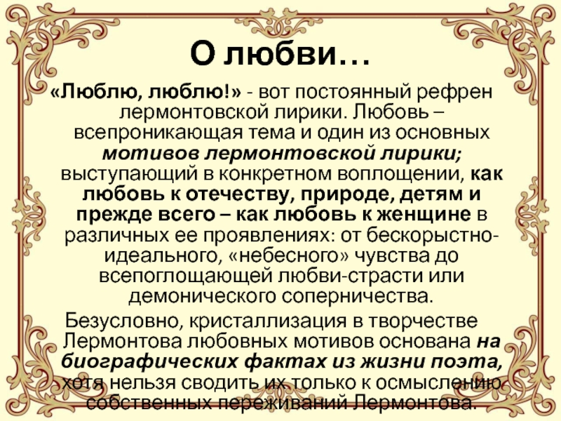 «Люблю, люблю!» - вот постоянный рефрен лермонтовской лирики. Любовь