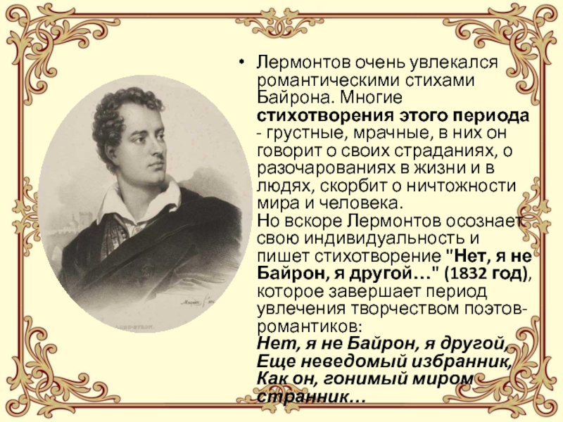 Слайд 9Лермонтов очень увлекался романтическими стихами Байрона. Многие стихотворения этого периода