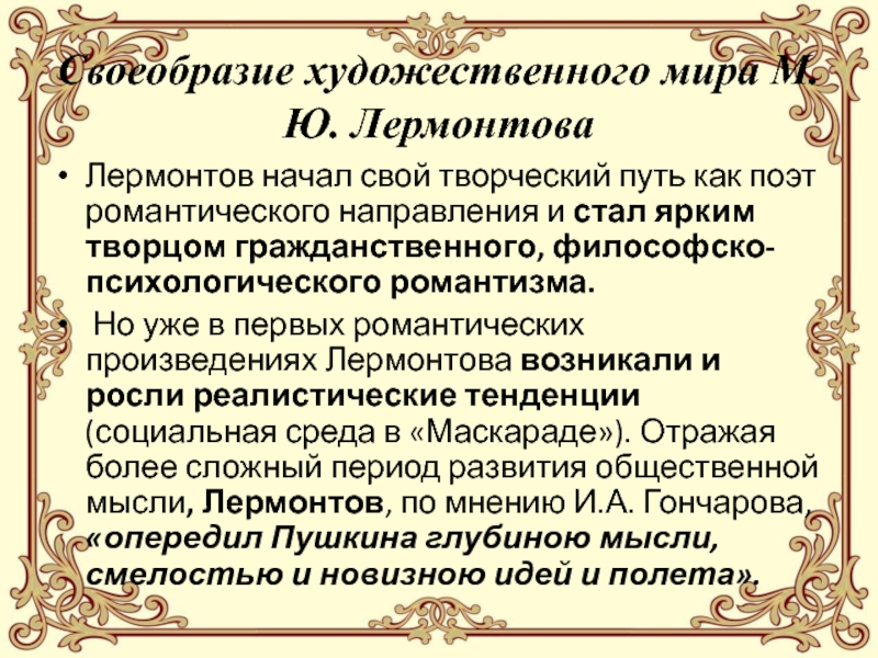 Но уже в первых романтических произведениях Лермонтова возникали и росли реалистические тенденции (социальная среда в «Маскараде»). Отражая более сложный период развития общественной мысли, Лермонтов, по мнению И.А. Гончарова, «опередил Пушкина глубиною мысли, смелостью и новизною идей и полета».