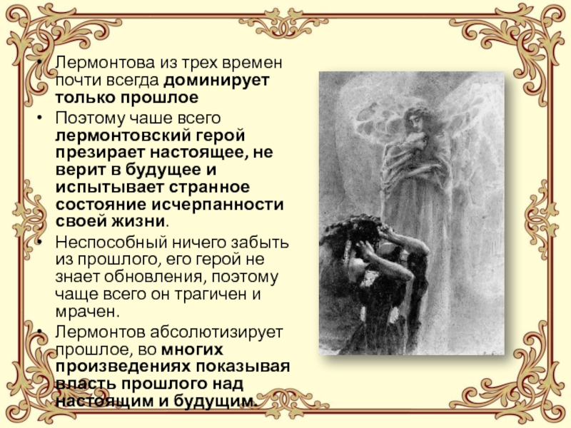 Лермонтов абсолютизирует прошлое, во многих произведениях показывая власть прошлого над настоящим и будущим.