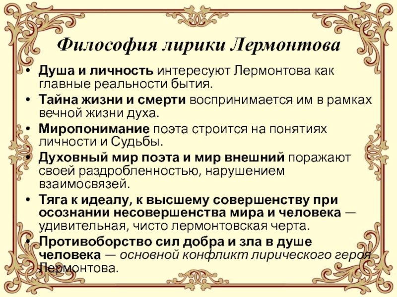 Противоборство сил добра и зла в душе человека — основной конфликт лирического героя Лермонтова.