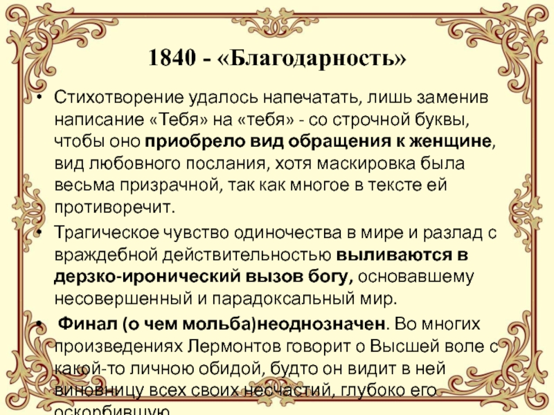 Финал (о чем мольба)неоднозначен. Во многих произведениях Лермонтов говорит о Высшей воле с какой-то личною обидой, будто он видит в ней виновницу всех своих несчастий, глубоко его оскорбившую.