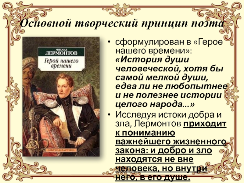 Исследуя истоки добра и зла, Лермонтов приходит к пониманию важнейшего жизненного закона: и добро и зло находятся не вне человека, но внутри него, в его душе.