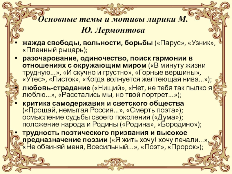 Слайд 22Основные темы и мотивы творчества М.Ю. Лермонтова
