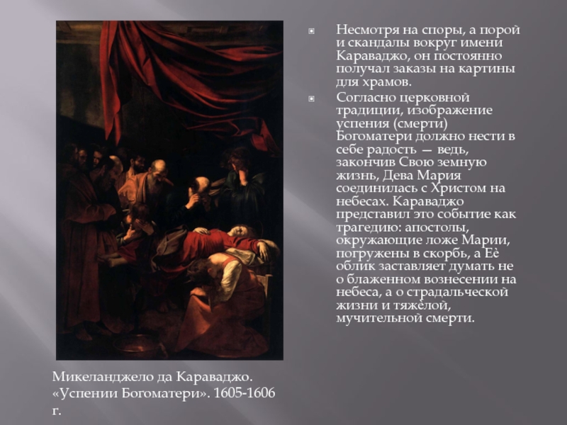 Микеланджело да Караваджо. «Успении Богоматери». 1605-1606 г.