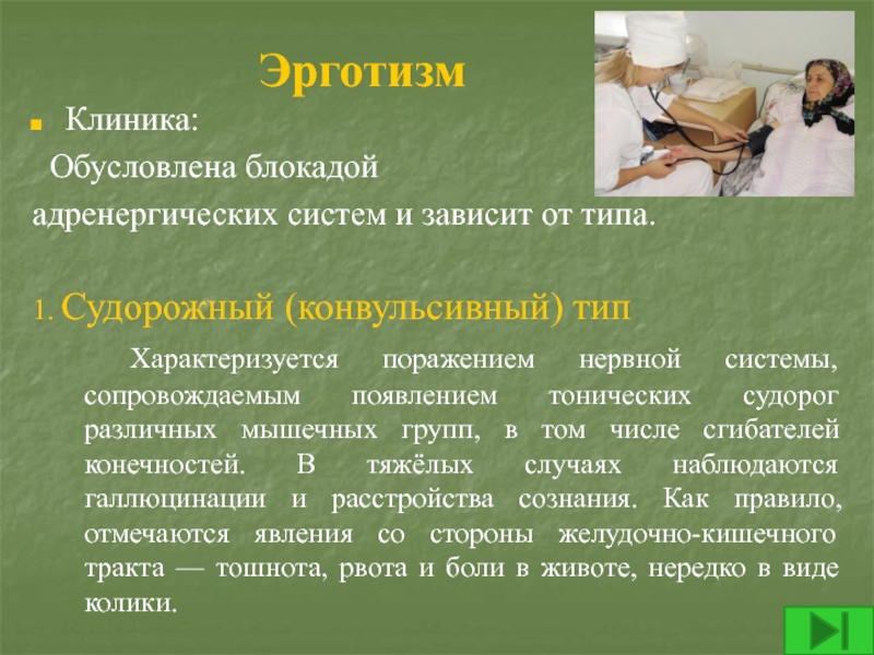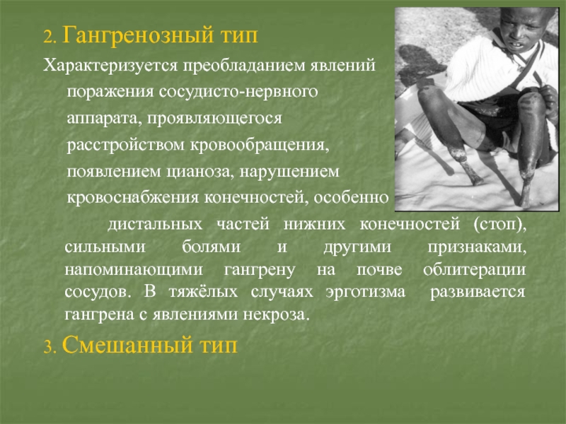 дистальных частей нижних конечностей (стоп), сильными болями и другими признаками, напоминающими гангрену на почве облитерации сосудов. В тяжёлых случаях эрготизма развивается гангрена с явлениями некроза.