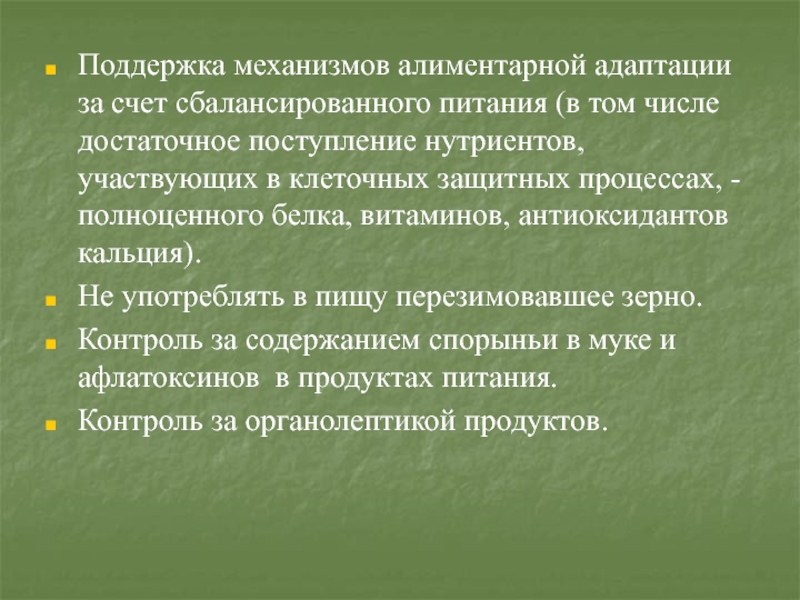 Слайд 14Поддержка механизмов алиментарной адаптации за счет сбалансированного питания (в том