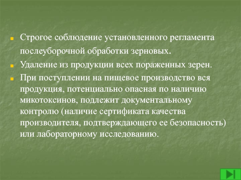 по наличию микотоксинов, подлежит документальному контролю (наличие сертификата качества производителя, подтверждающего ее безопасность) или лабораторному исследованию.