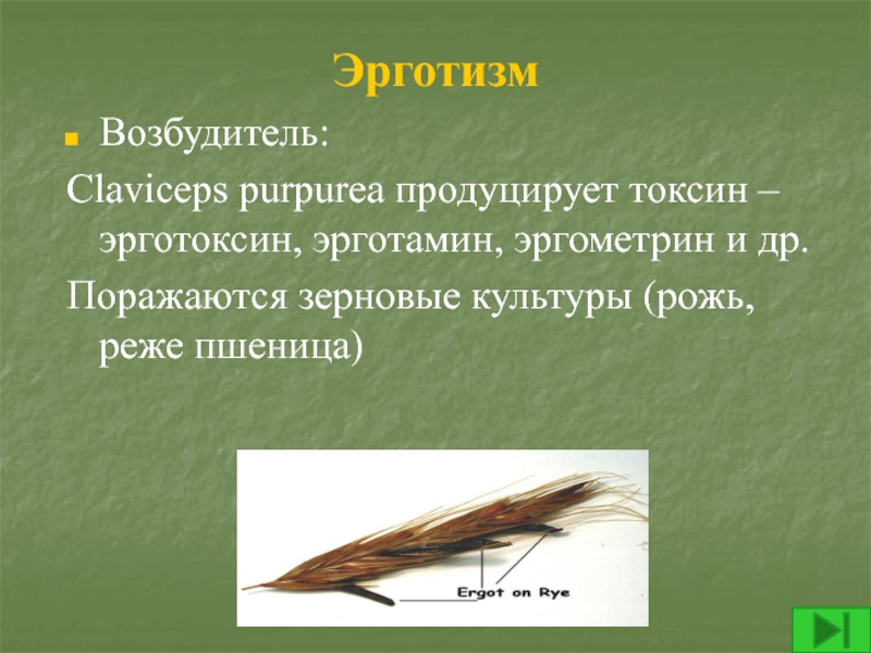 Claviceps purpurea продуцирует токсин – эрготоксин, эрготамин, эргометрин и др.