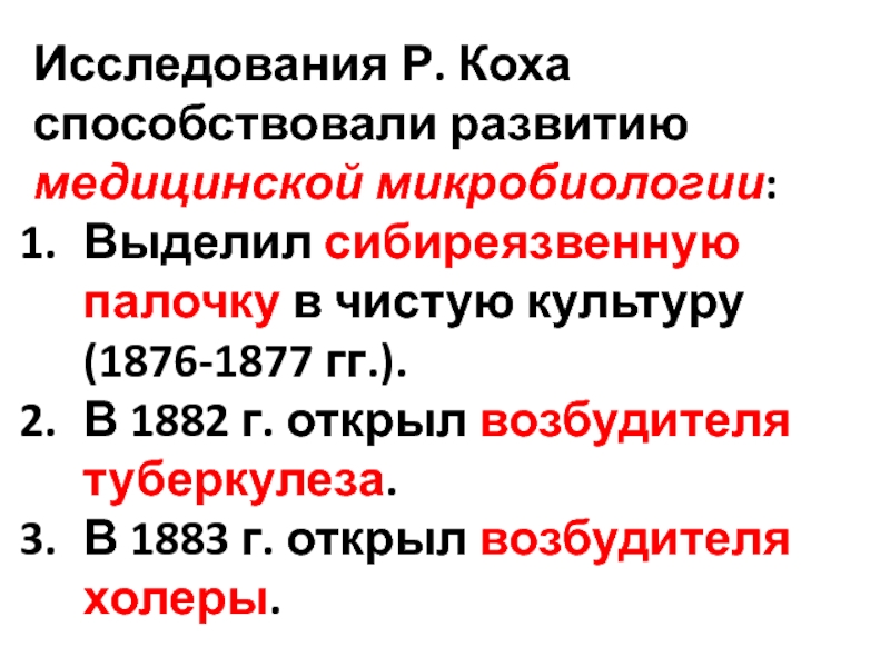 Слайд 18Исследования Р. Коха способствовали развитию медицинской микробиологии: