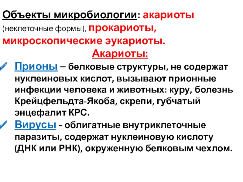 Слайд 5Объекты микробиологии: акариоты (неклеточные формы), прокариоты, микроскопические эукариоты.