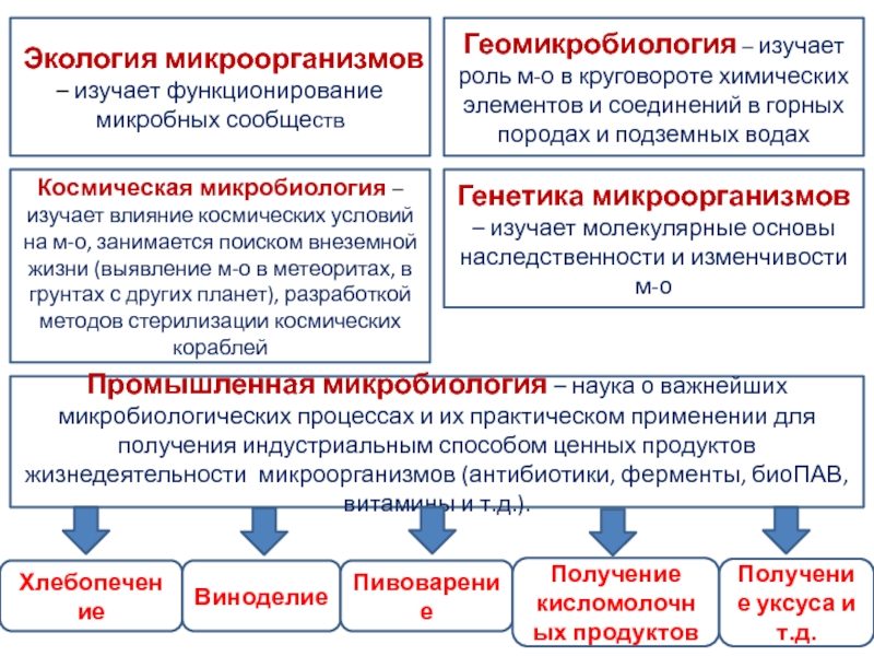Космическая микробиология – изучает влияние космических условий на м-о, занимается поиском внеземной жизни (выявление м-о в метеоритах, в грунтах с других планет), разработкой методов стерилизации космических кораблей