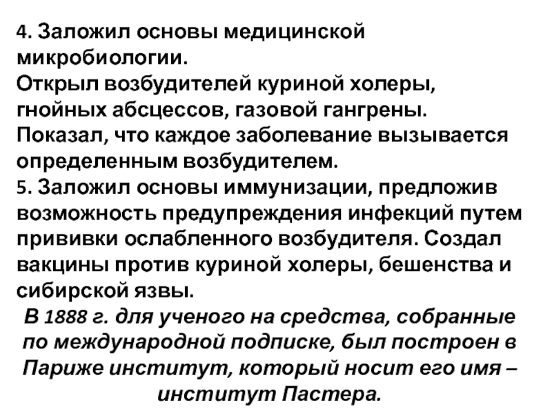 5. Заложил основы иммунизации, предложив возможность предупреждения инфекций путем прививки ослабленного возбудителя. Создал вакцины против куриной холеры, бешенства и сибирской язвы.