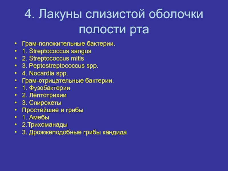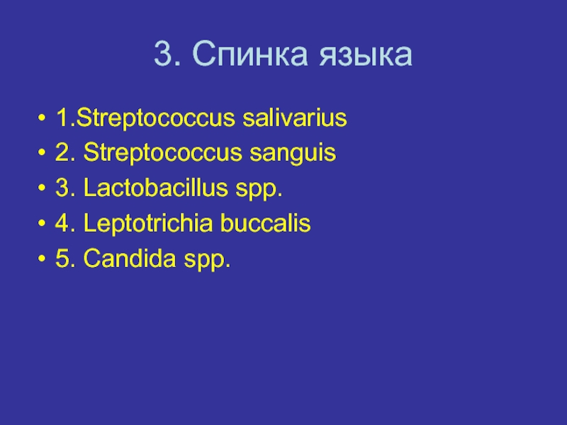 3. Спинка языка1.Streptococcus salivarius2. Streptococcus sanguis3. Lactobacillus spp.4. Leptotrichia buccalis5. Candida spp.