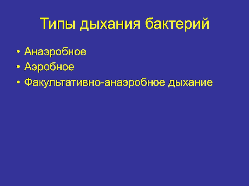 Типы дыхания бактерийАнаэробноеАэробноеФакультативно-анаэробное дыхание