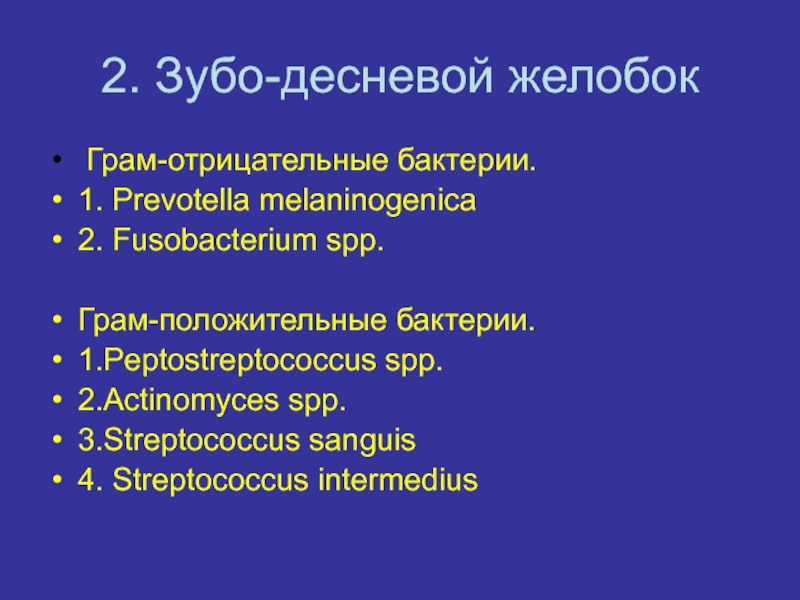 2. Зубо-десневой желобок Грам-отрицательные бактерии.1. Prevotella melaninogenica2. Fusobacterium spp.Грам-положительные бактерии.1.Peptostreptococcus spp.2.Actinomyces spp.3.Streptococcus sanguis4. Streptococcus intermedius