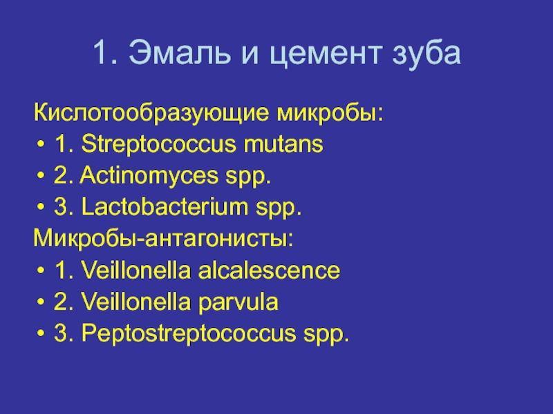 1. Эмаль и цемент зубаКислотообразующие микробы:1. Streptococcus mutans2. Actinomyces spp.3. Lactobacterium spp.Микробы-антагонисты:1. Veillonella alcalescence2. Veillonella parvula3. Peptostreptococcus