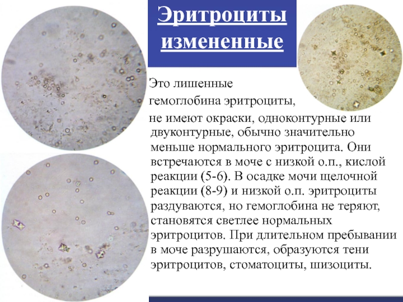 меньше нормального эритроцита. Они встречаются в моче с низкой о.п., кислой реакции (5-6). В осадке мочи щелочной реакции (8-9) и низкой о.п. эритроциты раздуваются, но гемоглобина не теряют, становятся светлее нормальных эритроцитов. При длительном пребывании в моче разрушаются, образуются тени эритроцитов, стоматоциты, шизоциты.