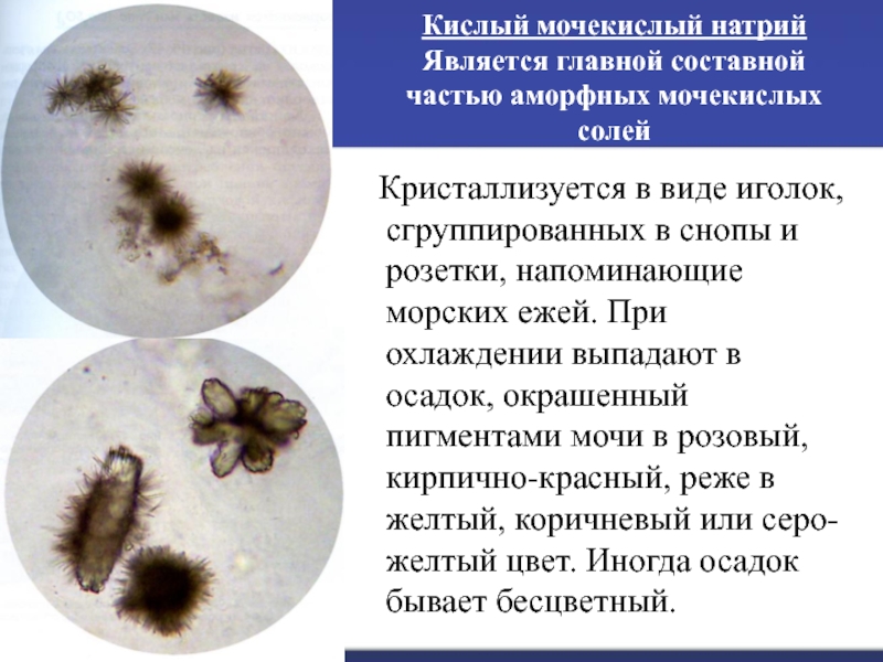 напоминающие морских ежей. При охлаждении выпадают в осадок, окрашенный пигментами мочи в розовый, кирпично-красный, реже в желтый, коричневый или серо-желтый цвет. Иногда осадок бывает бесцветный.