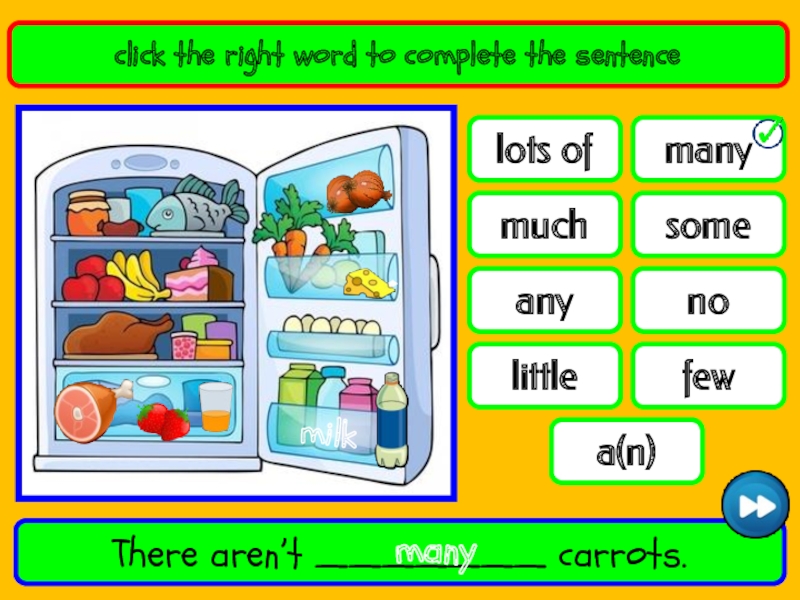 lots offewmanysomeanynolittlemucha(n)click the right word to complete the sentenceThere aren’t _______ carrots.manymilk