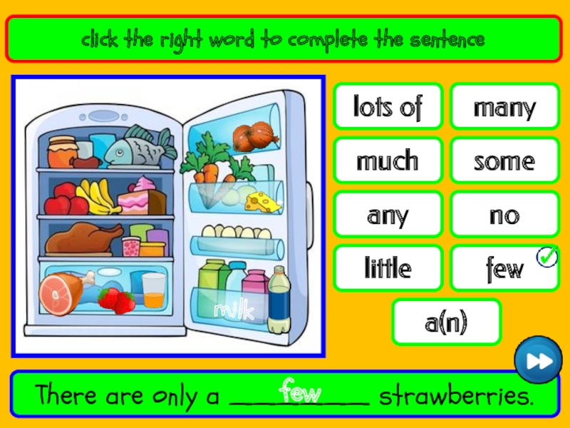lots ofmanyfewsomeanynolittlemucha(n)click the right word to complete the sentenceThere are only a ______ strawberries.fewmilk