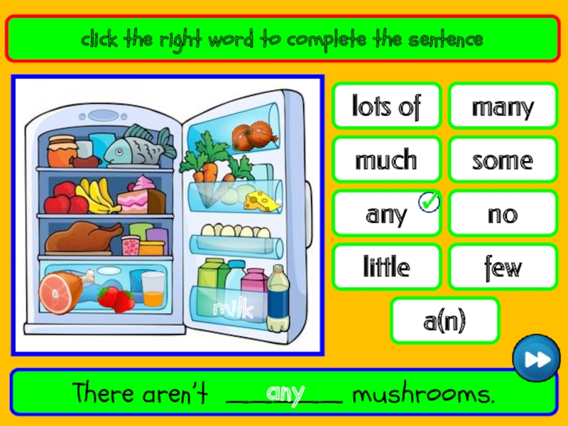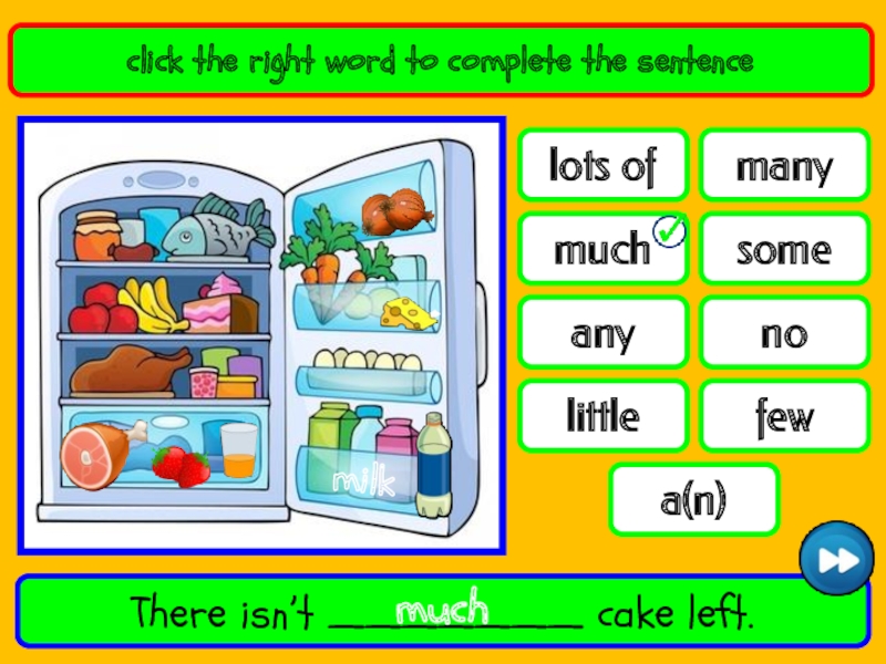 nofewlots ofsomeanymanylittlemucha(n)click the right word to complete the sentenceThere is _______ milk in the fridge.lots ofmilk