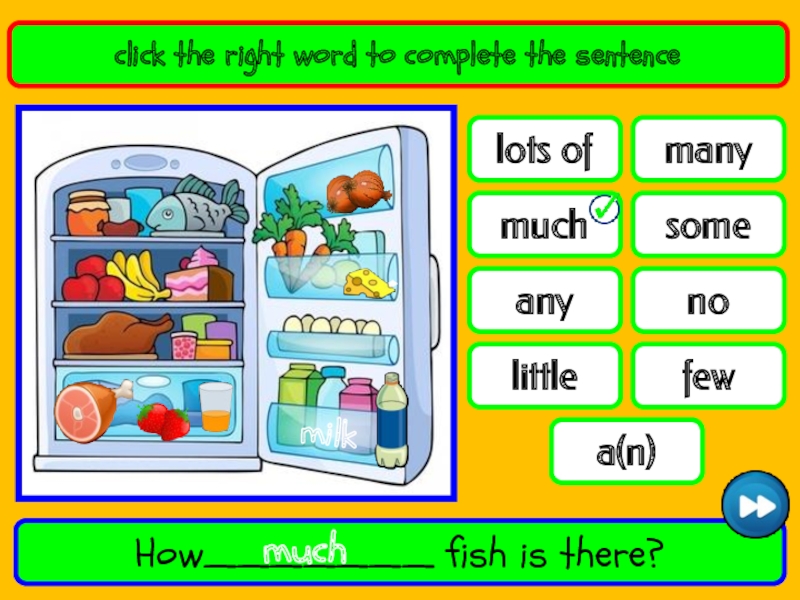 lots ofmanymuchsomeanynolittlefewa(n)click the right word to complete the sentenceHow_______ fish is there?muchmilk