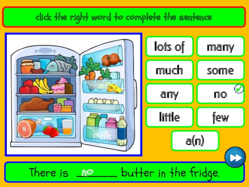 lots offewnosomeanymanylittlemucha(n)click the right word to complete the sentenceThere is ____ butter in the fridge.nomilk