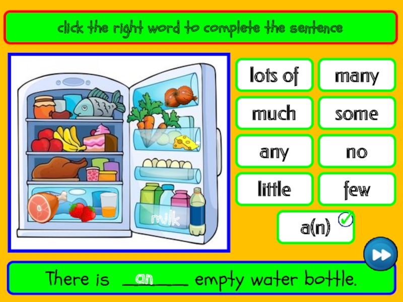 nofewa(n)lots ofanymanylittlemuchsomeclick the right word to complete the sentenceThere is ____ empty water bottle.anmilk