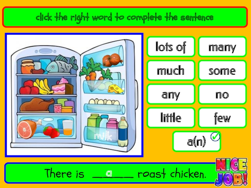 nofewa(n)lots ofanymanylittlemuchsomeclick the right word to complete the sentenceThere is ____ roast chicken.amilk