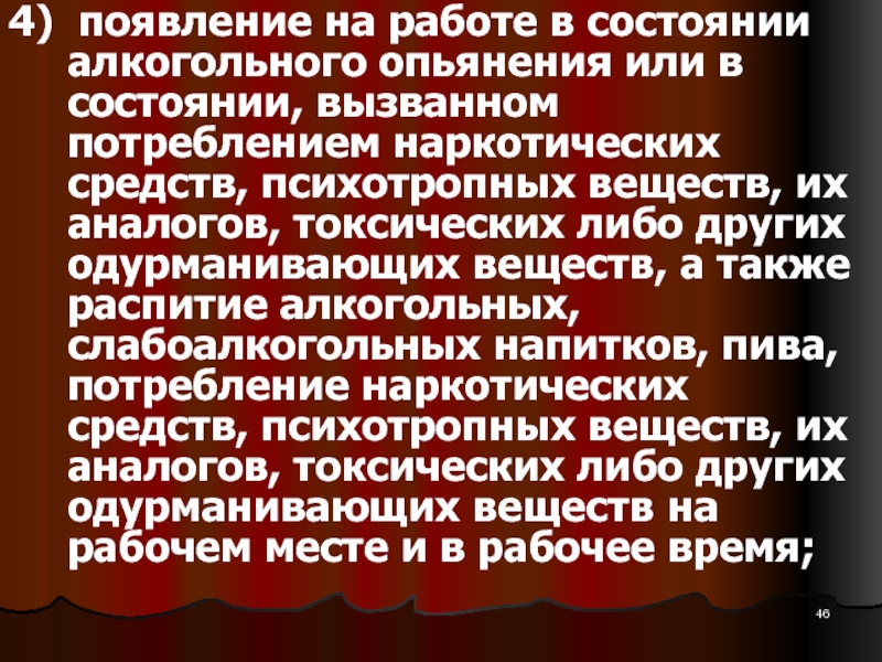 Слайд 464) появление на работе в состоянии алкогольного опьянения или в