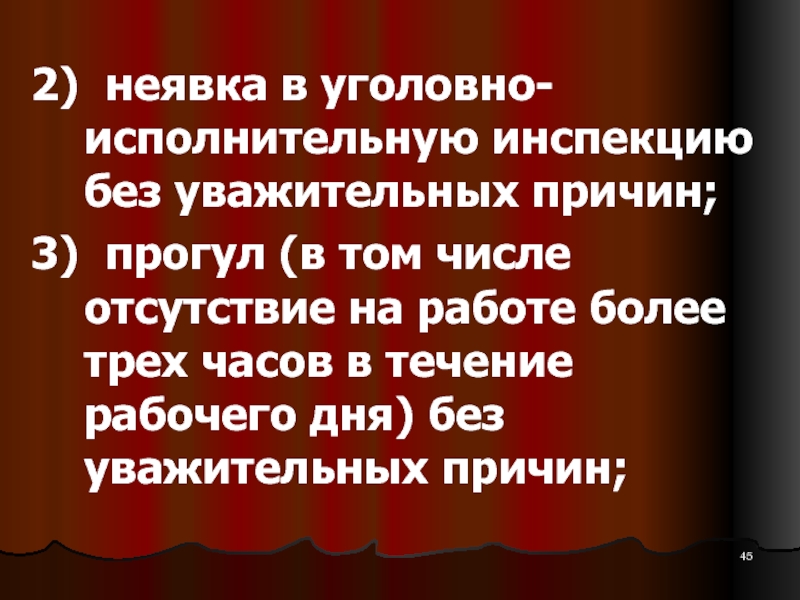 Слайд 452) неявка в уголовно-исполнительную инспекцию без уважительных причин;