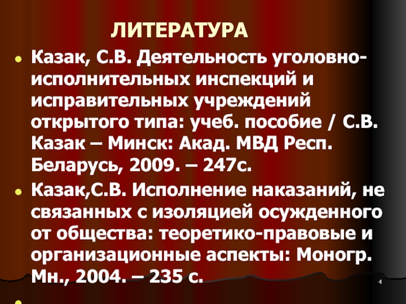 Казак,С.В. Исполнение наказаний, не связанных с изоляцией осужденного от общества: теоретико-правовые и организационные аспекты: Моногр. Мн., 2004. – 235 с.