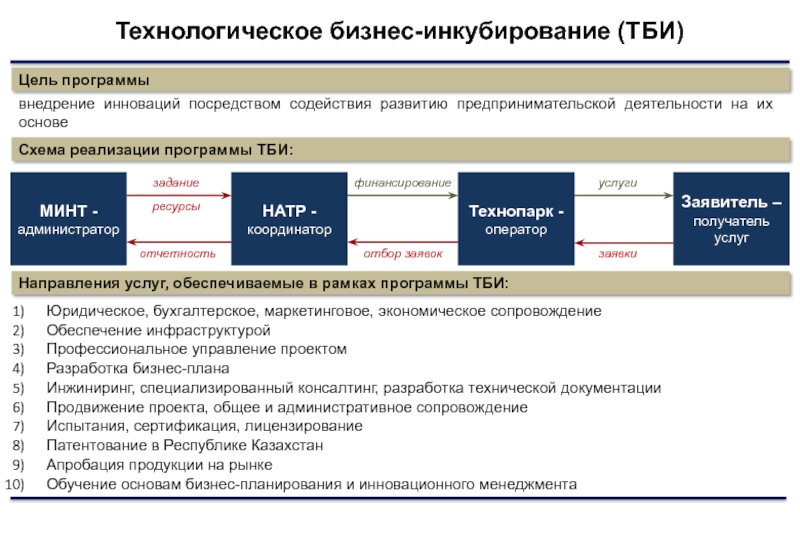 …4. Основным видом деятельности технопарков является технологическое бизнес-инкубирование, представляющее собой оказание субъектам индустриально-инновационной деятельности на начальном этапе их функционирования услуг по предоставлению помещений, оборудования, ведению бухгалтерского учета, юридическому, информационному и консультационному сопровождению, привлечению инвестиций, управлению проектами, а также иных услуг, необходимых для реализации индустриально-инновационных проектов».