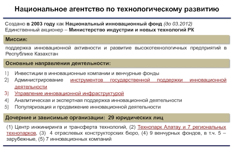 (1) Центр инжиниринга и трансферта технологий, (2) Технопарк Алатау и 7 региональных технопарков, (3) 4 отраслевых конструкторских бюро, (4) 9 венчурных фондов, в т.ч. 5 – зарубежные, (5) 7 инновационных компаний