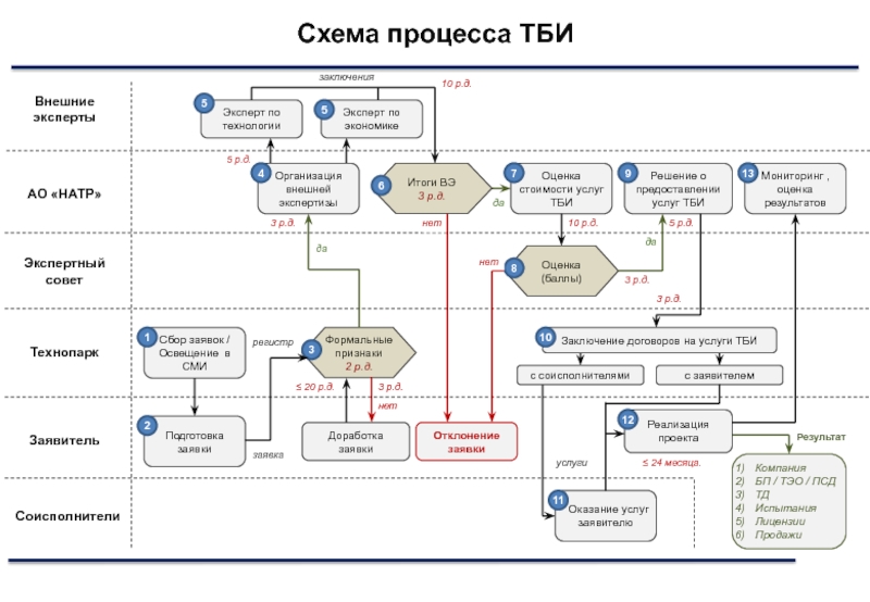 Внешняя экспертиза: два специалиста – с квалификацией в экономической и технологической частях проекта. Цель – оценить реализуемость проекта с учетом запрашиваемых ресурсов, запланированных результатов и других параметров. Результаты: (1) рекомендовать, (2) рекомендовать с учетом замечаний, (3) отказать в оказании услуг ТБИ.