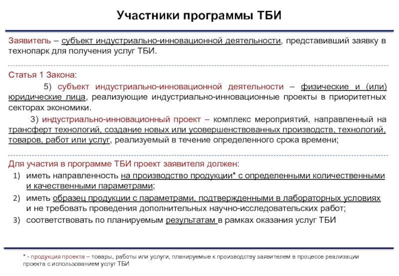 * - продукция проекта – товары, работы или услуги, планируемые к производству заявителем в процессе реализации проекта с использованием услуг ТБИ