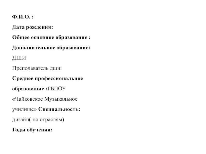 Ф.И.О. : Дата рождения: Общее основное образование : Дополнительное образование: ДШИ Преподаватель дши: Среднее профессиональное образование :ГБПОУ «Чайковское Музыкальное училище» Специальность: дизайн( по отраслям) Годы обучения: